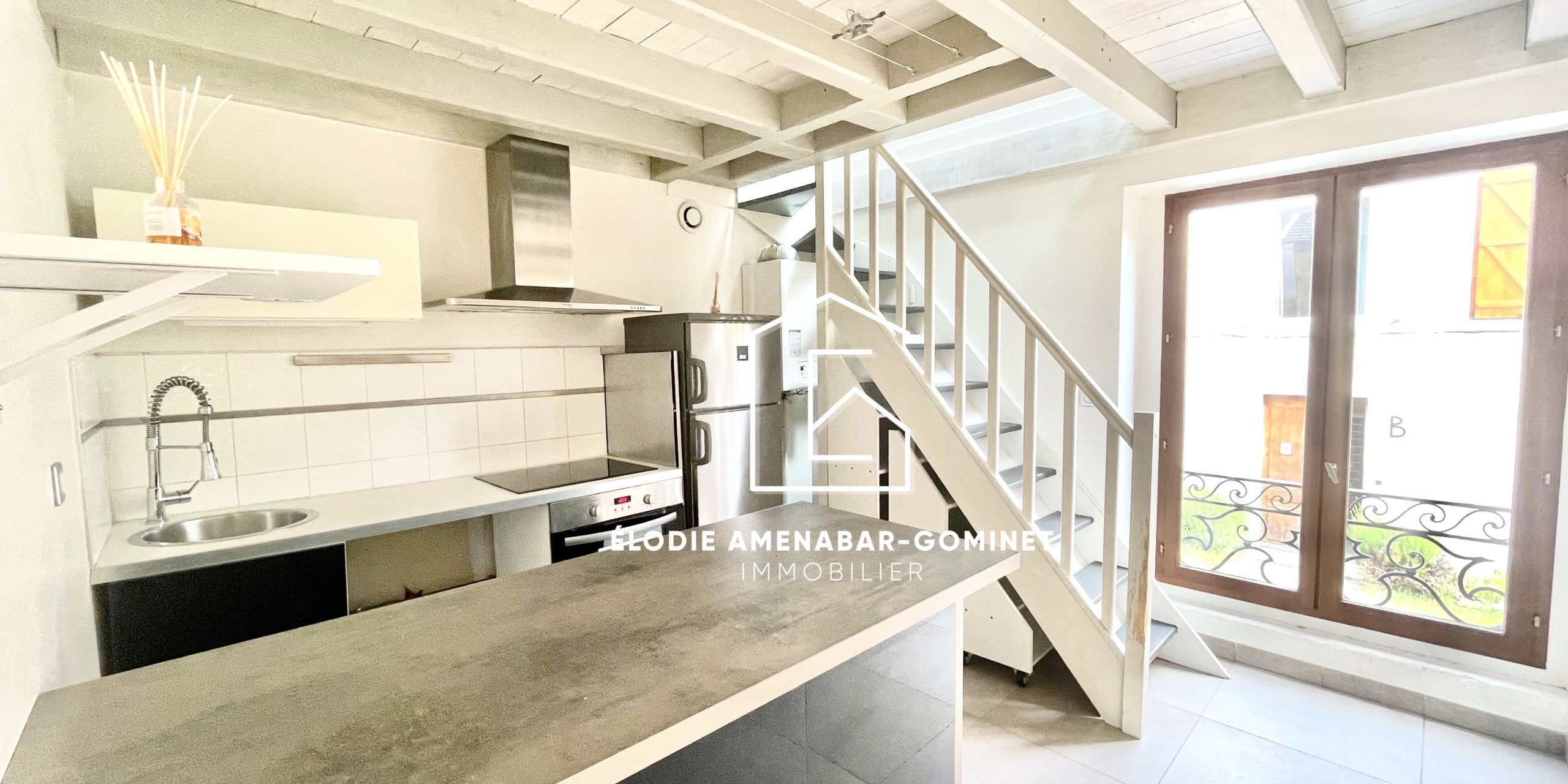 Le bien se compose d’une cuisine équipée et meublée ouverte sur un espace salle à manger, d’un séjour situé dans la partie de l’ancienne chapelle rénové en gardant le charme de l’ancien avec une belle hauteur sous plafond, d’un cellier avec branchement machine et un WC.